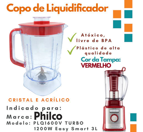 VENDA SOMENTE DO COPO, IMAGEM DO LIQUIDIFICADOR MERAMENTE ILUSTRATIVA.     PARA VERIFICAR O MODELO EXATO DO SEU LIQUIDIFICADOR, BASTA OLHAR NA ETIQUETA ABAIXO DO LIQUIDIFICADOR. DEPOIS DA COMPRA NOS ENVIAR A FOTO DO SEU LIQUIDIFICADOR PARA CONFIRMAR O MODELO.    Jarra/ Copo de Liquidificador compatível com a Marca BRITANIA E PHILCO para o modelo PLQ1600P TURBO 1200W Easy Smart BLQ1300P FORTIS BLQ1300V FORTIS TURBO 1200W do material Cristal/ Acrílico com Tampa Vermelha e não serve filtro. Compatível com Marca: BRITANIA e PHILCO Modelos: PHILCO: PLQ1600P TURBO 1200W Easy Smart 3L               BRITANIA: BLQ1300P FORTIS BLQ1300V FORTIS TURBO 1200W (OBS: OBSERVAR O ARRASTE DO COPO, ESSE MODELO TEM DOIS TIPOS (FIRENZE E REVERSE) ***** Foto disponível do modelo no anúncio CAPACIDADE: marcação vai até 1500 ml MODELO: Cristal / Acrílico COR DA TAMPA: Vermelha NAVALHA: 4 Lâminas serrilhadas Vantagens * Atóxico, livre de BPA; * Plástico excelente e de maior durabilidade e resistência; * Tem marcador de medidas para facilitar nas receitas, a marcação do copo vai até 1500 ml; * possui 4 dentes serrilhados na navalha podendo colocar alimentos mais duros e mais força na trituração. Atenção!! - Não possui filtro; - Não serve Filtro; *DEVOLUÇÃO Devolução garantida se não for compatível com seu liquidificador, mas para não ocorrer devolução por favor verifique a marca e modelo do seu liquidificador ou é claro, você pode me mandar suas dúvidas no campo de perguntas que responderei com maior prazer. Não deixe de usar seu eletrodoméstico por falta de algum acessório. Aproveite a praticidade que eles nos proporcionam no dia a dia.