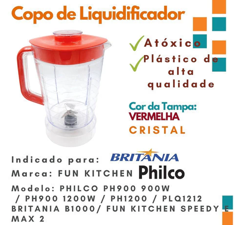 VENDA SOMENTE DO COPO, IMAGEM DO LIQUIDIFICADOR MERAMENTE ILUSTRATIVA.   Copo Jarra para Liquidificador compatível com a Marca PHILCO Modelo PH900 1200w / PH1200 1200W / PLQ915 / PLQ1212 com material Cristal/ Acrílico com Tampa VERMELHA, não serve filtro. Compatível com Marca: PHILCO Modelo: PH900 1200w / PH1200 1200W / PLQ915 / PLQ1212 (compatível com o mesmo modelo mas de outras cores) ***** Foto disponível do modelo no anúncio CAPACIDADE: marcação vai até 1500 ml MODELO: Cristal / Acrílico COR DA TAMPA: VERMELHO NAVALHA: 4 Lâminas serrilhadas Vantagens * Atóxico, livre de BPA; * Não serve Filtro; * Acrílico excelente e de maior durabilidade e resistência; * Tem marcador de medidas para facilitar nas receitas, a marcação do copo vai até 1500 ml. * Possui 4 dentes serrilhados na navalha podendo colocar alimentos mais duros e mais força na trituração. Atenção!! - Não possui filtro; ***DEVOLUÇÃO*** Devolução garantida se não for compatível com seu liquidificador, mas para não ocorrer devolução por favor verifique a marca e modelo do seu liquidificador ou é claro, você pode me mandar suas dúvidas no campo de perguntas que responderei com maior prazer. Não deixe de usar seu eletrodoméstico por falta de algum acessório. Aproveite a praticidade que eles nos proporcionam no dia a dia.