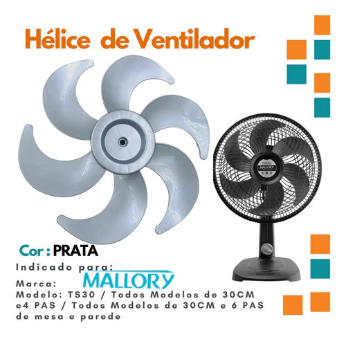 VENDA SOMENTE DA HELICE, IMAGEM DO VENTILADOR MERAMENTE ILUSTRATIVA!   Aumente a potência do seu ventilador, helice de ventilador de 30 cm e com 6 PAS, garanta já seu vento forte! Hélice para Ventilador compatível com a Marca MALLORY com TS30 , TODOS OS MODELOS DE TAMANHO 30 cm de 6 Pás   Compatível com Marcas: MALLORY Modelos: Todos Modelos de 30CM e 6 PAS de mesa e parede / TS30 (de todas as cores)   Quantidade Pas: 6 Pás Tamanho: 30 cm Cor: Prata Vantagens * Plástico de excelente durabilidade, resistência; ***DEVOLUÇÃO*** Devolução garantida se não for compatível com seu ventilador, mas para não ocorrer devolução por favor verifique a marca e modelo do seu ventilador ou é claro, você pode me mandar suas dúvidas no campo de perguntas que responderei com maior prazer. Não deixe de usar seu eletrodoméstico por falta de algum acessório. Aproveite a praticidade que eles nos proporcionam no dia a dia.