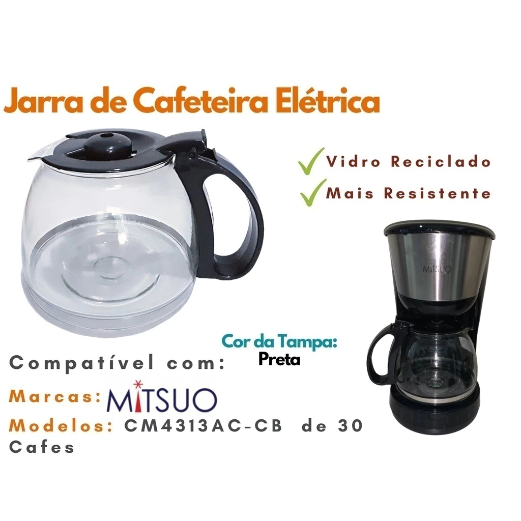 *****Anuncio para venda somente da Jarra, imagem da cafeteira meramente ilustrativa*****Jarra para Cafeteira Elétrica semelhante compatível com a marca Mitsuo modelo CM4313AC-CB de 30 xicaras com tampa preta.Marcas: MITSUOModelo compatível:CM4313AC-CB de  30 Xicaras** Foto Disponível dos modelos da Cafeteira Elétrica-----MEDIDAS DA JARRA------Altura da jarra c/ Tampa: 12,5 cmLargura da Jarra: 19 cm Altura da Jarra: 12 cmDiâmetro da Base (encaixa na chapa quente): 10 cmDiâmetro da Base: 15 cm#Foto com exemplo das medidasVocê receberá: 01 Jarra para Cafeteira Elétrica com tampa pretaProduto similar com alta qualidade e resistência.***DEVOLUÇÃO***Devolução garantida se não for compatível com sua cafeteira elétrica, mas para não ocorrer devolução por favor verifique a marca e modelo do sua cafeteira ou é claro, você pode me mandar suas dúvidas no campo de perguntas que responderei com maior prazer.Não deixe de usar seu eletrodoméstico por falta de algum acessório. Aproveite a praticidade que eles nos proporcionam no dia a dia.