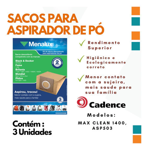 *** VENDA APENAS DO SACO, IMAGEM DO ASPIRADOR MERAMENTE ILUSTRATIVA***   O saco de aspirador de pó é fabricado de papel de alta qualidade que garante uma excelente eficiencia de filtragem. Para obter os melhores resultados de limpeza, substitua regurlamente os filtros e os sacos de pó.   Sacos descartáveis para aspirador de pó compatível com a marca CADENCE   Modelos listados abaixo: - MAXX CLEAN 1400 - ASP503   Especificações: Marca: Menalux, distribuido por Electrolux Você recebera: 1 pacote com 3 sacos descartavéis   * Menor contato com a sujeira, mais saúde para sua família; * Melhor custo-benefício; * Preserve seu aspirador de pó e aumente a vida útil trocando com mais frequência os sacos descartáveis; * Saco novo aumenta o poder de sucção do aspirador; * Retire seu aspirador do armário e tenha mais praticidade na limpeza, sem dor nas costas e corpo; * Aproveite os benefícios do seu eletrodoméstico;   DEVOLUÇÃO:  Devolução garantida se não for compatível com seu aspirador de pó, mas para não ocorrer devolução por favor verifique a marca e modelo do seu aspirador ou é claro, você pode me mandar suas dúvidas no campo de perguntas que responderei com maior prazer.   IMPORTANTE: Depois da compra favor nos enviar a foto do seu aspirador para confirmação do modelo para que não haja devolução. Caso tenha algum problema com sua compra não abra reclamação, nos chame no chat do vendedor que daremos todo o suporte.   Não deixe de usar seu eletrodoméstico por falta de algum acessório. Aproveite a praticidade que eles nos proporcionam no dia a dia.